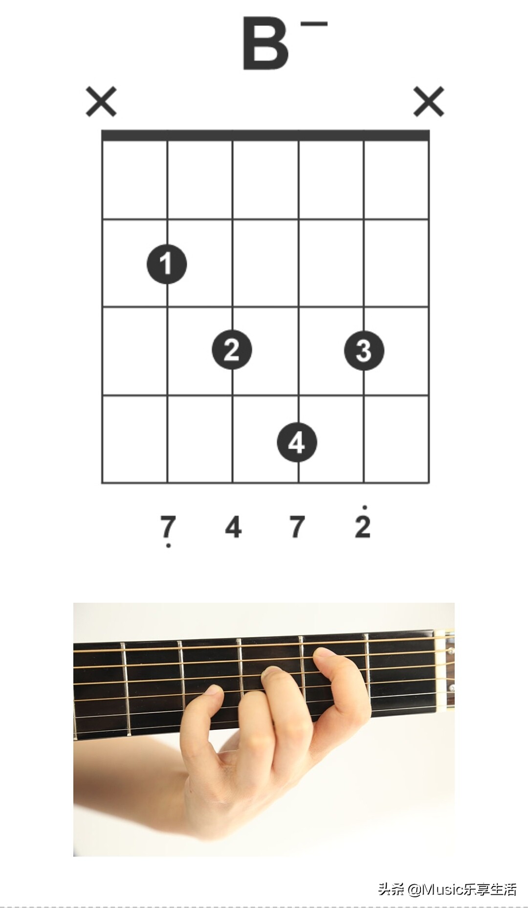 初学者如果还不能练会F和弦的大横按,可以用下面这个F和弦的按法来代替。