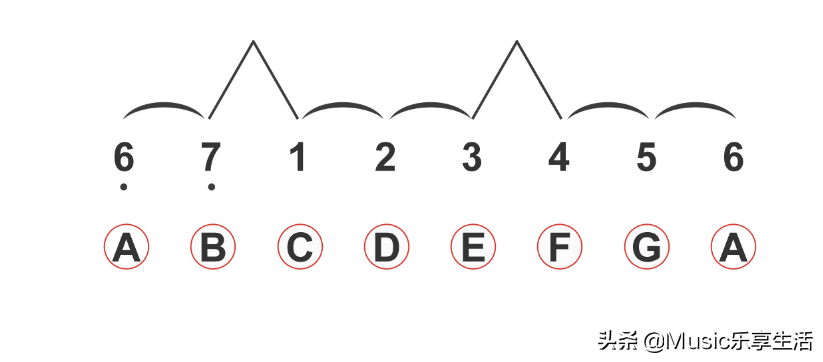 A调以6(la)为该调式音阶的主音,按照小调音阶“全、半、全、全、半、全、全、”的音程特点确定下音阶中其他六个音符。A小调表现出的感情色彩通常较为忧郁、悲伤。