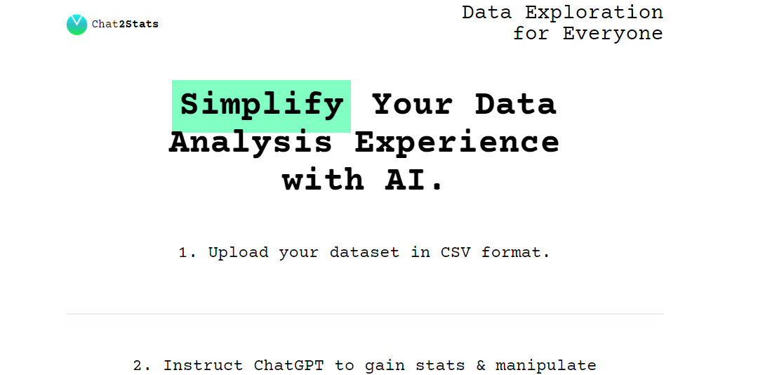 Chat2Stats功能 Chat2Stats是一种基于 AI 的数据分析工具,它利用 OpenAI 的 ChatGPT 来简化和精简数据分析过程。它使用户能够分析来自各种来源和格式的数据,提取有价值的见解以推动业务增长。 主要特征: AI 驱动的数据分析:利用 OpenAI 的 ChatGPT 来简化数据分析过程。 多种数据源和格式:支持来自各种来源的数据分析,包括对话、调查、反馈表、评论等。 用户友好的界面:具有直观且易于使用的界面,无需专业的数据科学技能。 定制报告生成:使用户能够生成定制报告以满足他们特定的分析需求。 实时数据分析:提供实时分析功能,让用户在处理数据时获得洞察力。 统计建模:结合统计建模技术来揭示数据中有意义的模式和趋势。 可扩展集成:与现有业务系统无缝集成,增强工作流程和运营效率。 用例: 寻求分析来自各种来源的大量数据以做出明智决策的企业和组织。 寻找不需要专业数据科学技能的用户友好型数据分析工具的专业人士。 希望深入了解客户行为、市场趋势和业务的其他关键方面的决策者和分析师。 旨在通过集成 AI 技术简化数据分析工作流程并提高运营效率的公司。 Chat2Stats通过提供简单高效的 AI 驱动数据分析解决方案,使用户能够充分发挥其数据的潜力。