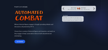 自动战斗功能 该工具由 AE Studio 开发,提供结合娱乐和教育的交互式体验,用户可以在玩乐中学习。 主要特征: AI 生成的辩论:见证 GPT-4 生成的重要历史人物之间的辩论。 丰富的历史人物选择:从各种历史人物和人物中进行选择,以观看进行生动的对话。 多才多艺的演示:以各种辩论中的历史人物为特色,例如类似说唱战斗的场景。 用户友好的界面:允许轻松选择角色和对话流程。 用例: • 教育:作为一种呈现历史信息的独特方式,该工具具有巨大的教育潜力。 • 娱乐:提供一种独特且有趣的方式来了解历史和历史人物。 • 历史爱好者:提供了解重要历史人物信仰和思想的新视角。 Automated Combat 是一种创新的人工智能工具,为用户提供了一种独特而有趣的方式来见证历史辩论和讨论。
