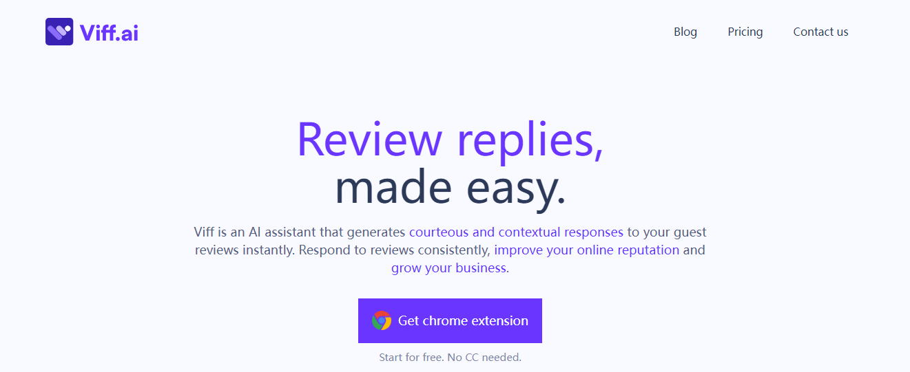 Viff 对酒店客人的评论生成个性化的、上下文相关的和礼貌的回复。它学习用户的语气和品牌声音,并以相同一致的声音生成响应。 立即回复:当员工有 100 件事要做时,回复评论可能会很困难。Viff 从初始输入中学习您的语气和品牌声音。立即做出准确的回复,并始终如一地回复所有客人评论。 提高声誉:当企业回复评论时,87% 的旅行者更有可能进行预订。回复会让您脱颖而出,并让正在研究下一次住宿的旅行者充满信心。 增加预订量:我们的客户在对所有评论做出持续回应仅 6 个月后,预订量就增长了 5 倍,TripAdvisor 排名提高了 67%。
