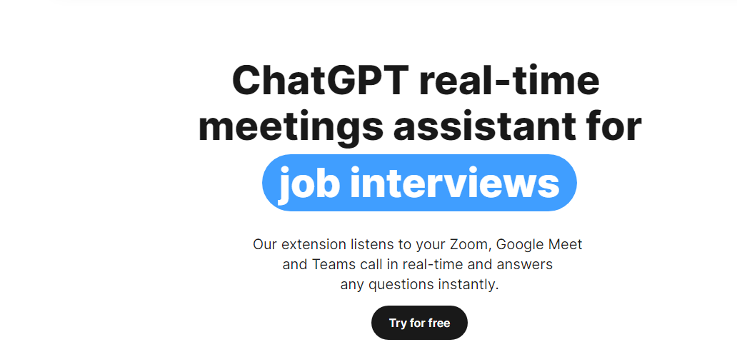 查德维尤特点 Chadview 是一款人工智能驱动的实时会议助手,旨在帮助个人准备技术工作面试、技术销售电话和语音支持。 主要特征: 实时协助:该工具监听用户的呼叫,并在按下“ASK”按钮后 3-4 秒内生成适当的响应。 由 ChatGPT API 提供支持:Chadview 的 AI 引擎可为编程、分析和数学问题提供准确的答案。 访问用户的 CRM 和沟通渠道:Chadview 可以帮助解决技术销售电话中的复杂问题,提高客户满意度并达成交易。 用例: • 准备技术工作面试并在通话期间获得实时帮助。 • 在技术销售拜访期间提高客户满意度并达成交易。 • 获得有关编程、分析和数学问题的准确答案。 • 通过 15 分钟的免费试用来练习和提高面试技巧。 总体而言,Chadview 是一款基于人工智能的实时会议助手,通过提供准确且相关的实时答案,帮助用户准备技术工作面试、技术销售电话和语音支持。