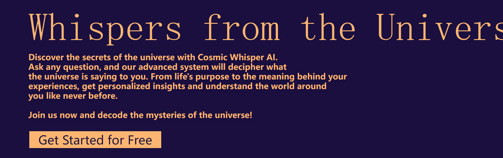 宇宙低语人工智能功能 获得对生活目的、经历背后的意义的个性化见解,并以前所未有的方式增强对周围世界的理解。 主要特征: 先进的人工智能系统:解释和破译宇宙的信息以获得个性化的见解。 宇宙理解:揭示生命的目的和经历背后的意义。 个性化指导:获得针对您的问题和兴趣量身定制的独特见解。 用例: • 探索生命和宇宙的更深层意义。 • 获得个性化见解以更好地了解您的体验。 • 向宇宙寻求个人成长和自我意识的指导。 通过 Cosmic Whisper AI 深入探索宇宙的秘密,更深入地了解您的生活,提供个性化的见解,以增强您的意识和成长。