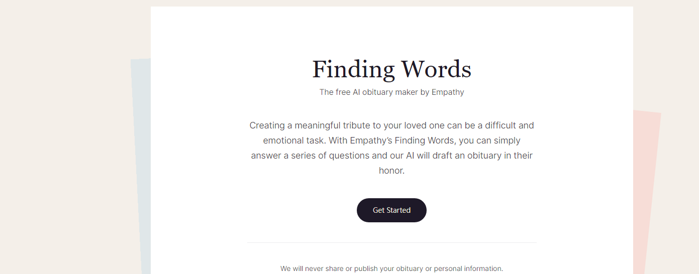 找词功能 Empathy's Find Words是一款人工智能驱动的讣告制作工具,旨在为逝去的亲人创作有意义的悼念。主要特点和优势包括: 引导过程:在生成讣告草案之前向用户询问一系列有关死者的问题 可编辑草稿:允许用户修改生成的草稿以满足他们的需求 免费且安全:确保用户的讣告和个人信息永远不会被共享或发布 Empathy 的 Find Words用例非常适合各种个人: 失去亲人的家庭寻求帮助,为他们的亲人表达衷心的敬意 殡葬服务提供商希望提供用户友好的讣告创建工具 寻求安全且私密的方式来创建讣告的个人 总体而言,Empathy 的 Find Words 为在困难时期制作有意义的讣告提供了一个支持性且安全的平台。