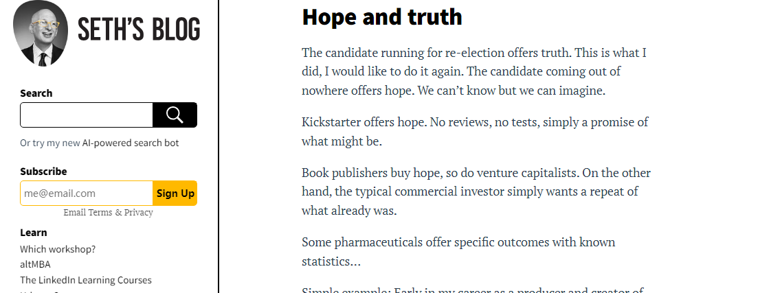 Seths 聊天机器人功能 Seths 聊天机器人允许用户提出问题并接收人工智能根据 Seth 的写作生成的回复。人工智能经过了赛斯写作风格和内容的专门训练。主要特点和优势包括: 有用且信息丰富的响应:人工智能旨在为用户查询提供有用的答案。 访问和易用性:通过单击博客主页上的“提问”按钮来访问该工具,用户可以使用文本框提交问题。 反馈机制:用户可以使用“向上”或“向下”符号对响应提供反馈,并根据需要提交其他反馈。 额外的参与:该工具为博客访问者提供了额外的参与和互动层。 营销相关主题:该工具对于那些寻求营销相关主题实用建议的人特别有用。 对于那些对 Seth Godin 的工作感兴趣并寻求快速可靠的问题答案的人来说,该工具是一种独特的创新资源。它为用户提供了一种以新的交互式方式参与博客内容的方式。