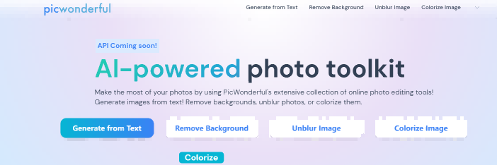 图片精彩功能 PicWonderful是一款人工智能照片工具包,提供多种在线照片编辑工具。用户可以从文本生成图像、删除背景、消除照片模糊、为图像着色、增强照片以及执行强大的编辑和图形设计功能。 主要特征: 文本到图像生成:从文本生成图像,非常适合社交媒体帖子、引言和个性化图形。 背景去除:准确、轻松地从图像中去除背景。 自动图像增强:利用人工智能算法增强图像质量并提高视觉吸引力。 彩色化:将黑白照片转换为充满活力且逼真的彩色图像。 图形设计功能:添加文本、形状、过滤器和叠加层以创建具有专业外观的设计和图形。 用户友好的界面:易于使用的界面适合所有经验水平的用户。 用例: 社交媒体内容创建:为社交媒体平台创建具有视觉吸引力且可共享的图像。 背景操作:隔离主题、替换背景或为各种设计目的创建透明叠加层。 图像增强:通过增强颜色、细节和照明来提高照片的质量和视觉吸引力。 为历史照片上色:通过添加鲜艳的色彩和真实感,使旧的黑白照片变得栩栩如生。 平面设计:无需高级设计技能即可设计令人惊叹的图形、宣传材料或个性化视觉效果。 PicWonderful是一款全面的人工智能照片工具包,使用户能够增强、转换和创建视觉上令人惊叹的图像。