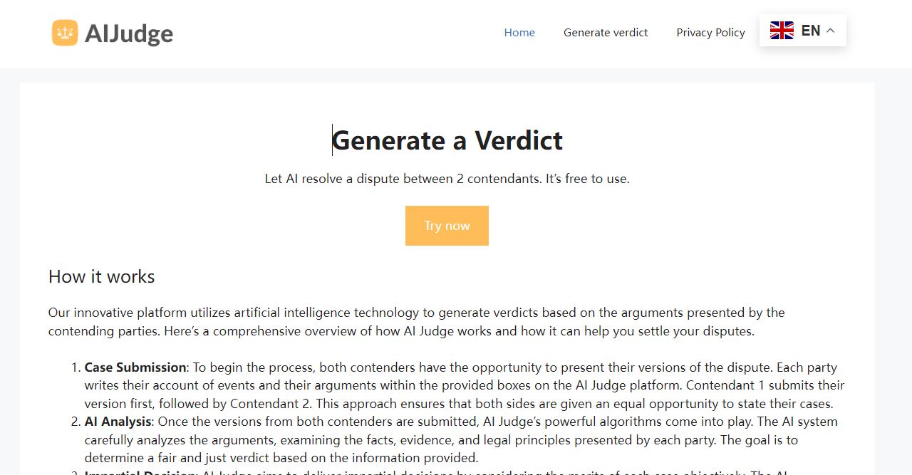 AI Judge以其人工智能驱动的平台重新定义了争议解决,引入了一种生成公正在线判决的创新方法。该平台利用先进的人工智能技术来全面评估冲突各方提出的论点,并随后做出公平的判断。