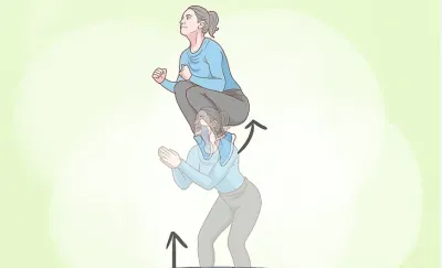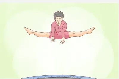从蹦床中心跳下,将双腿推到身体下方。当你处于跳跃的最高点时,将双腿向前迈出,在你面前形成一个V字形。弯曲你的背部并触摸你的脚趾。当重力将您拉回来时,将双腿并拢并将双手向两侧推回原来的位置。