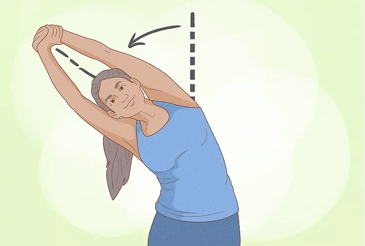 从站立位置开始,将手臂举过头顶,双手握在一起,但食指保持伸直。吸气并尽可能高、长地伸展,将臀部向一侧摇动。缓慢地深呼吸5 秒钟,然后回到起始位置,将手臂保持在头顶。