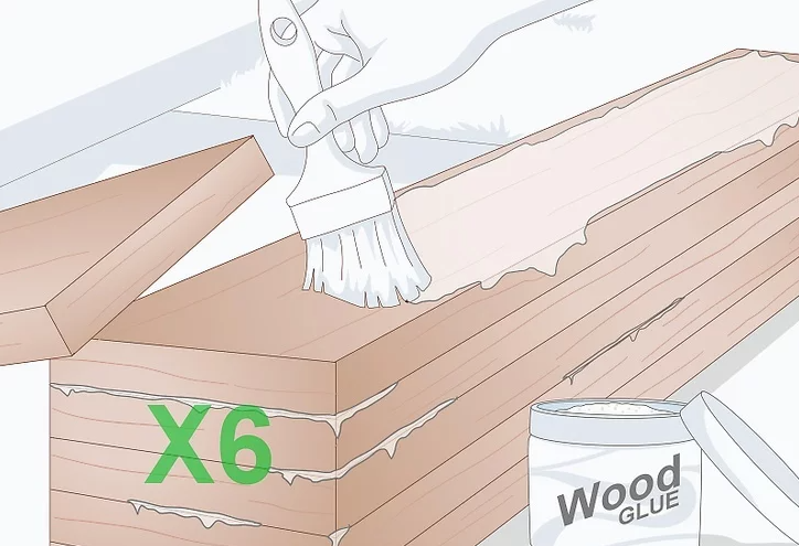 将板垂直放置。用工业胶(最好是防水的[1] )粘合木板的最宽表面(表面最平坦的侧面) 。使用足够的胶水,使它们牢固地相互粘合。在进行下一步之前,请确保它们完全干燥。