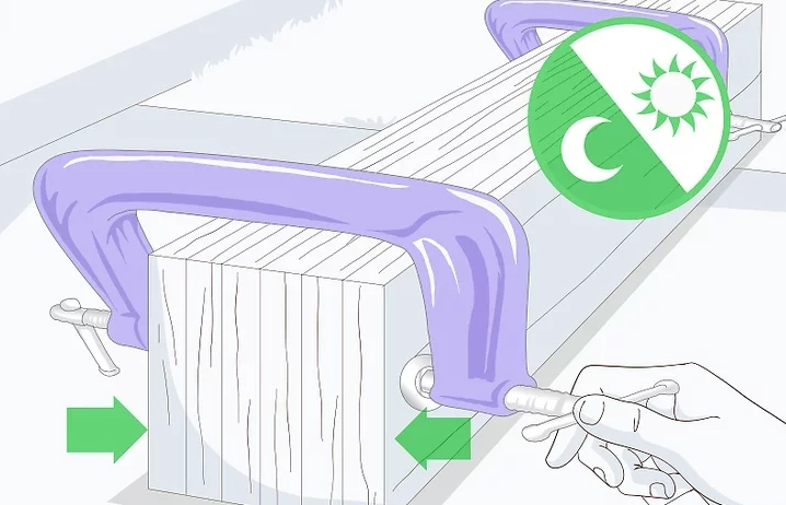 固定横梁的最佳方法是使用夹具。如果没有,请将横梁放在地面上,并在顶部放置一个重物,以便木板能够很好地融合在一起。