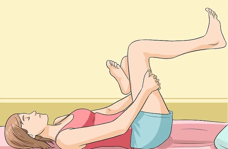对于“针眼”位置,躺在床上,膝盖弯曲,双脚平放在床垫上。将右膝盖靠近胸部,并将右脚踝放在左膝盖上。弯曲你的脚以保持肌肉收缩。将左脚从床垫上抬起,轻轻地将其移向胸部。慢慢呼气。然后在另一侧重复。