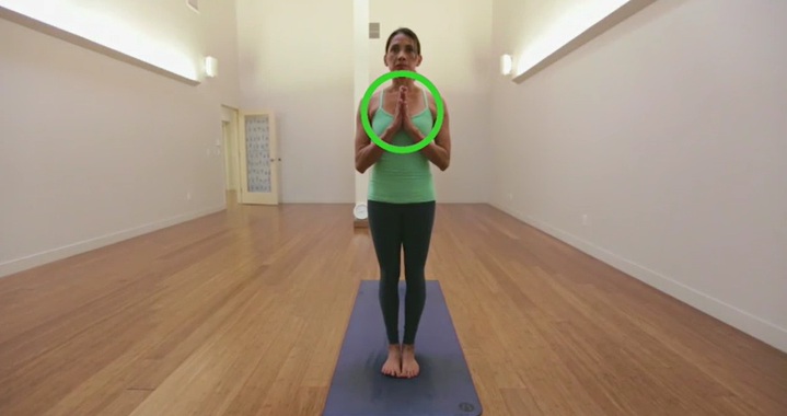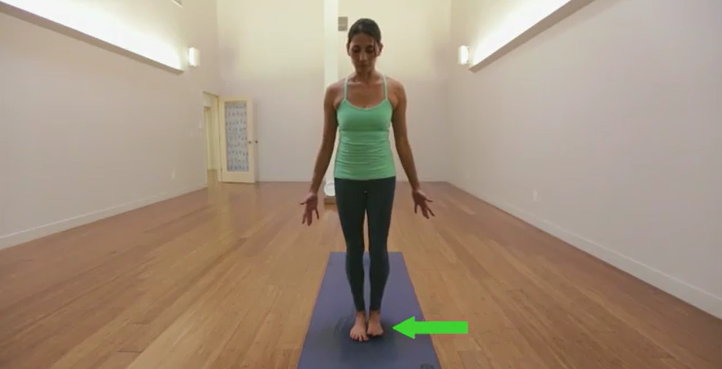 在山式或山式中,您站在瑜伽垫前,双脚并拢,双臂放在身体两侧。向前看,张开脚趾,确保您的重量均匀分布在双脚上。