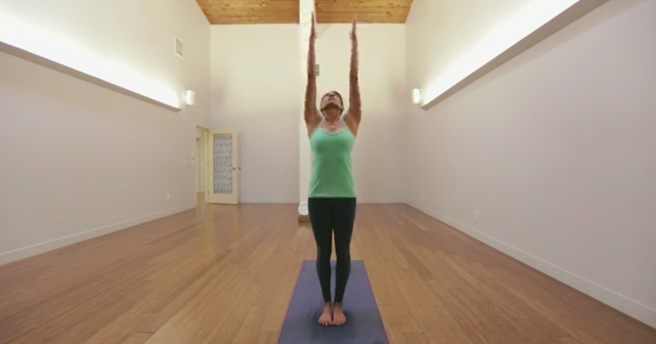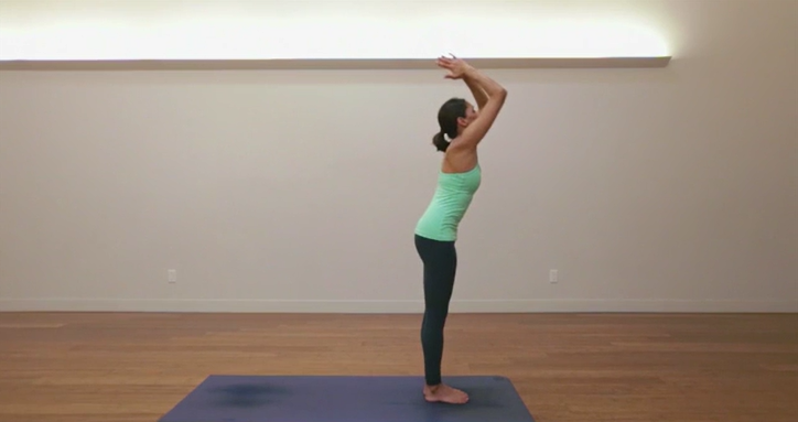 一旦你找到了你的意图,吸气并将双手举向天花板,向上敬礼也称为 urdhva hastasana。轻轻拱起背部,目光越过双手。