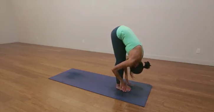 呼气并“俯冲”,发现自己处于前倾姿势,也称为 uttanasana。