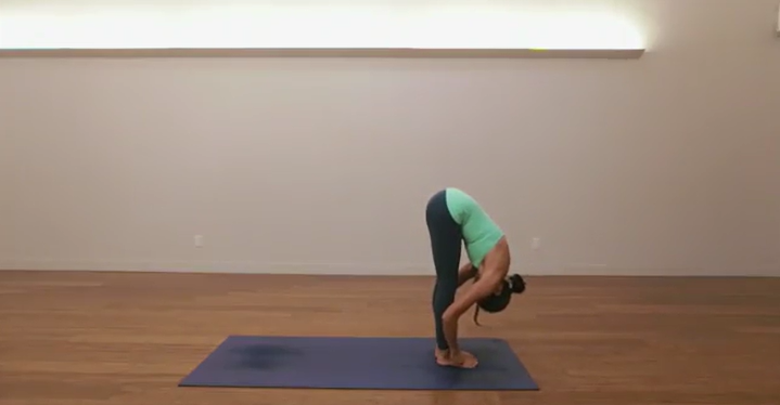 从鞠躬姿势 (urdhva hastasana) 转变为前倾姿势 (uttanasana) 时,保持背部挺直并向前倾斜非常重要。