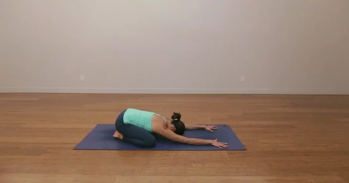 首先跪在瑜伽垫上。将膝盖并拢,将屁股放在脚上。呼气,将躯干轻轻靠在大腿上,使前额接触垫子。