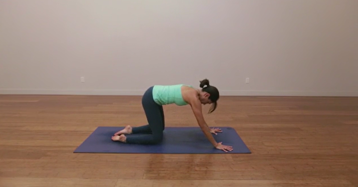 将肩膀滚动至下背部,手臂向内滚动,使肘部彼此相对。
