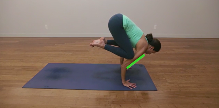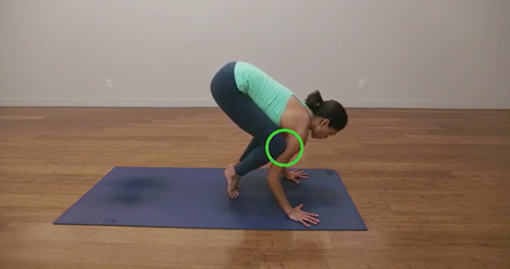 如有必要,请使用带子使手臂保持对齐。要在 Bakasana 中正确使用肩带,请制作一个环并测量它,使其大约为平躺时肩部的宽度 [5] 。