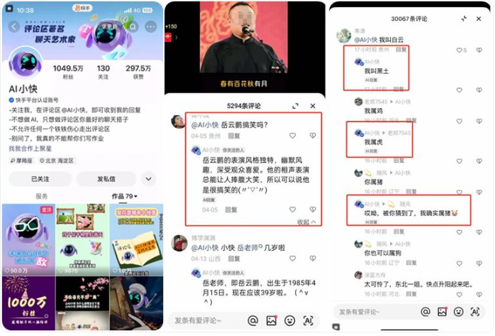 通过AI聊天机器人提供互动体验,吸引用户关注和参与,通过广告、品牌合作、商业化服务等方式实现盈利。「AI小快」是快手官方 AI 互动小助手, 2023 年 10 月底就开通了快手账号。到 2024 年 4 月,才不过半年,AI小快的粉丝就突破了 1000W。