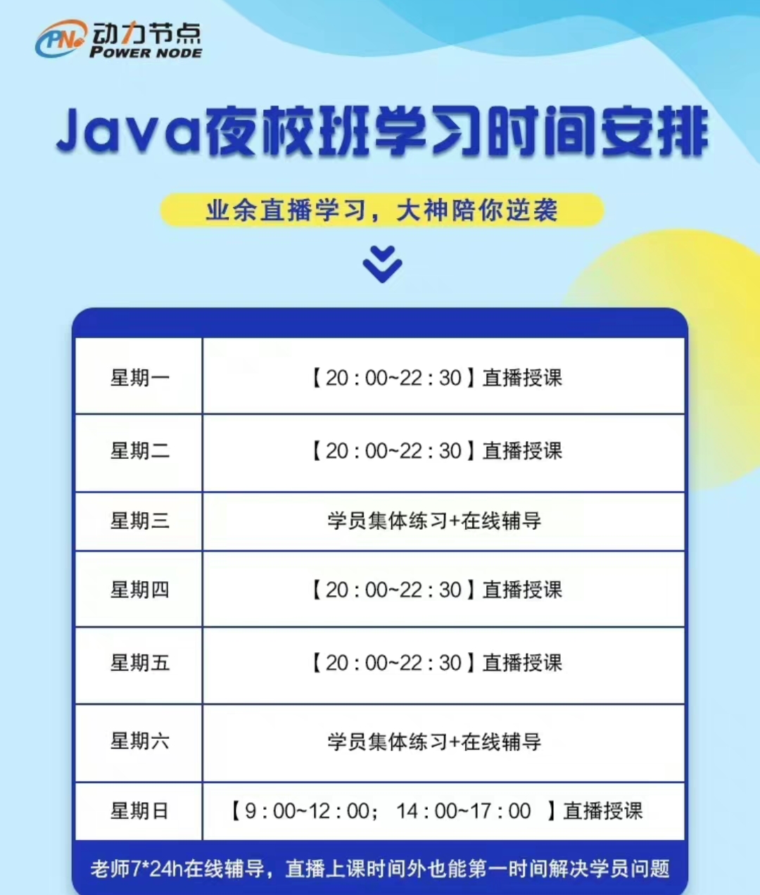 转动力节点Java培训班课程, 两年的跟班课程,2024年2月10日到期,6个月一个完整的学习周期(包括SE和框架),所以还可以上2.5轮,中途跟不上可以随时跟着下个班再继续重新学,终身免费看回放和动力节点的学习资料! 授课方式:夜校,在线!